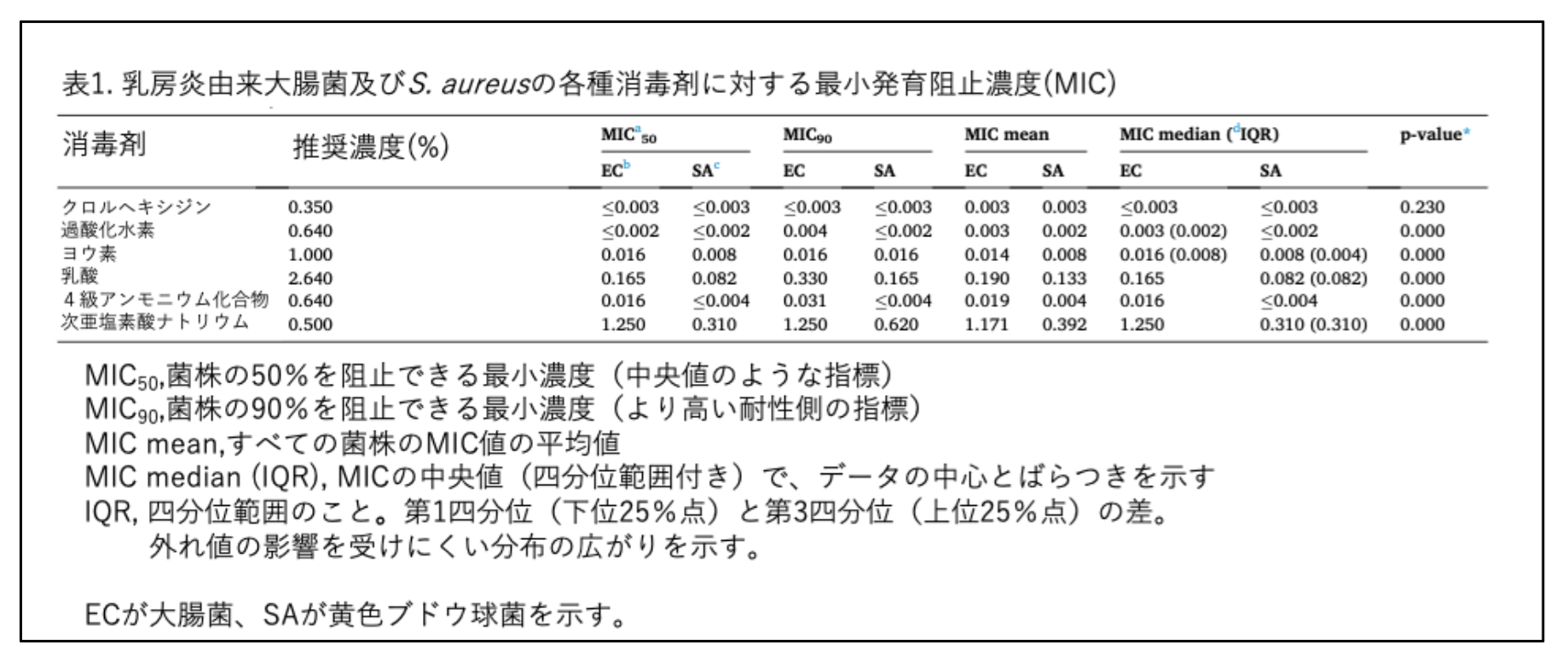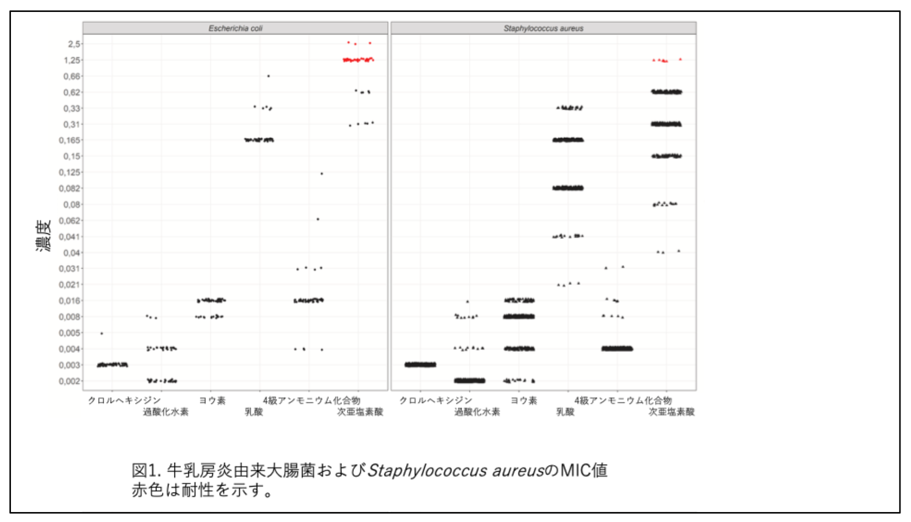 乳房炎は酪農業における最も重要な疾病の一つであり、中でも大腸菌と黄色ブドウ球菌(Staphylococcus aureus)は乳房炎の原因菌として比較的よく分離されます。乳房炎の予防を目的として、搾乳前後に消毒剤による乳頭消毒が行われますが、継続的な消毒薬の曝露は薬剤耐性株の出現に寄与する可能性があります。そこで本研究では、乳房炎の原因となる大腸菌52株およびS. aureus 400株の乳頭消毒用消毒剤に対する感受性を評価することを目的として実施しました。解析を行った消毒剤はクロルヘキシジン、過酸化水素、ヨウ素、乳酸、4級アンモニウム化合物、次亜塩素酸ナトリウムです。感受性試験は、微量液体希釈法により実施し、最小阻止濃度(MIC)を測定しました。