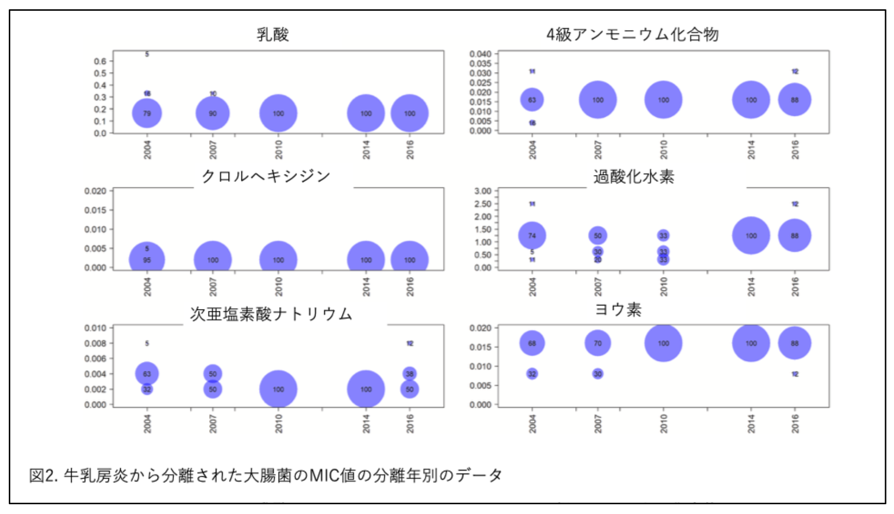すべての大腸菌およびS. aureusは、現場で使用される濃度よりも低い濃度のクロルヘキシジン、過酸化水素、ヨウ素、乳酸、4級アンモニウム化合物で発育が抑制されました(表1、図1)。次亜塩素酸ナトリウムに関しては、大腸菌の81%(42/52)が乳頭消毒に推奨される濃度では感性を示さず、S. aureusの35%(138/400)はMICが推奨される濃度以上で耐性でした。分離年ごとにMIC値をプロットしたところ、いくつかの消毒剤に関してはMIC値が増加する傾向が認められ、最近の分離株ほど多くの消毒剤に対して耐性傾向を示しました(図2. 3)。特にS. aureusにおいて、乳酸と次亜塩素酸ナトリウムに対しては耐性傾向を示した。