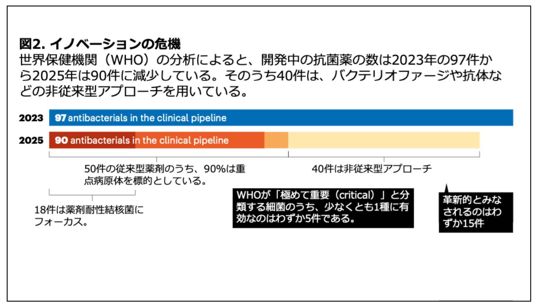 薬剤耐性菌問題に対抗するため、新規の抗菌薬の開発が期待されます。しかし、新規の抗菌薬の開発は滞っている状況です。薬剤の開発状況としては、2023年には97種類が開発中の抗菌薬としてあったものの、2025年には90種類に減少しています(図2)。また、臨床試験段階にある薬剤の中には未だに革新性を欠くものが多いと指摘されています(確信的と見なされるのは、90種類のうち、わずか15種類)。WHOなどの調査によると、世界中で232の研究開発プログラムが進められていますが、その大半は小規模な企業によるものであり、これは研究開発の脆弱性を示しています。多くの大手製薬会社は、資金不足や承認率の低さを背景に、抗菌薬市場から撤退しています。
