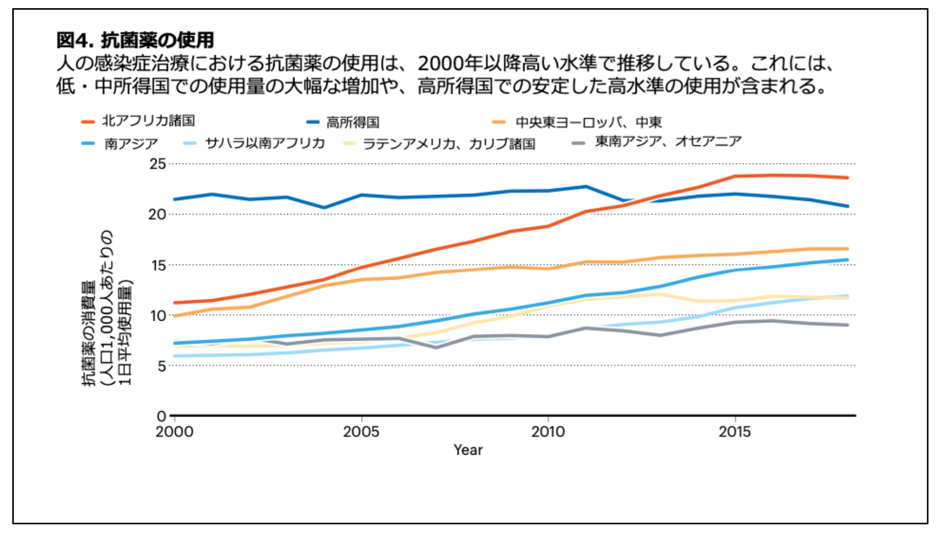 抗菌薬の乱用や不適切な使用、感染症治療における診断の遅れが、問題視されています。特に、動物用抗菌薬の使用量は増加傾向にあり、2019年から2040年にかけて約30%増加すると予測されています(図3)。中でもアジア太平洋地域での抗菌薬の使用量の増加が懸念されています。また、人の感染症の治療における抗菌薬の使用量は2000年以降、高い水準で推移しています(図4)。この間、低中所得国での使用量が増加してきています。低中所得国での抗菌薬の使用量の増加は、抗菌薬の不足や医療インフラの脆弱さから、適切な治療が行き届かない状況が原因とされています。