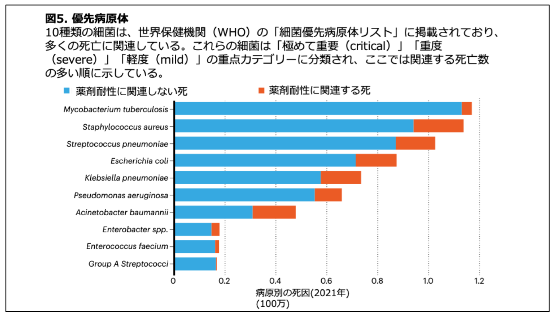 WHOが2024年に公開した「優先病原体リスト」では、特に耐性率の高いグラム陰性菌が注目されています。例えば、大腸菌やAcinetobacter baumanniiなどです(図5)。抗菌薬の必要性は非常に高まっているものの、薬剤開発のペースは遅く、なかなか進展していません。AI(人工知能)を利用した新薬開発の試みも進行中ですが、AIによる設計や合成の課題もあり、臨床段階に持ち込むには依然として多くのハードルがあります。