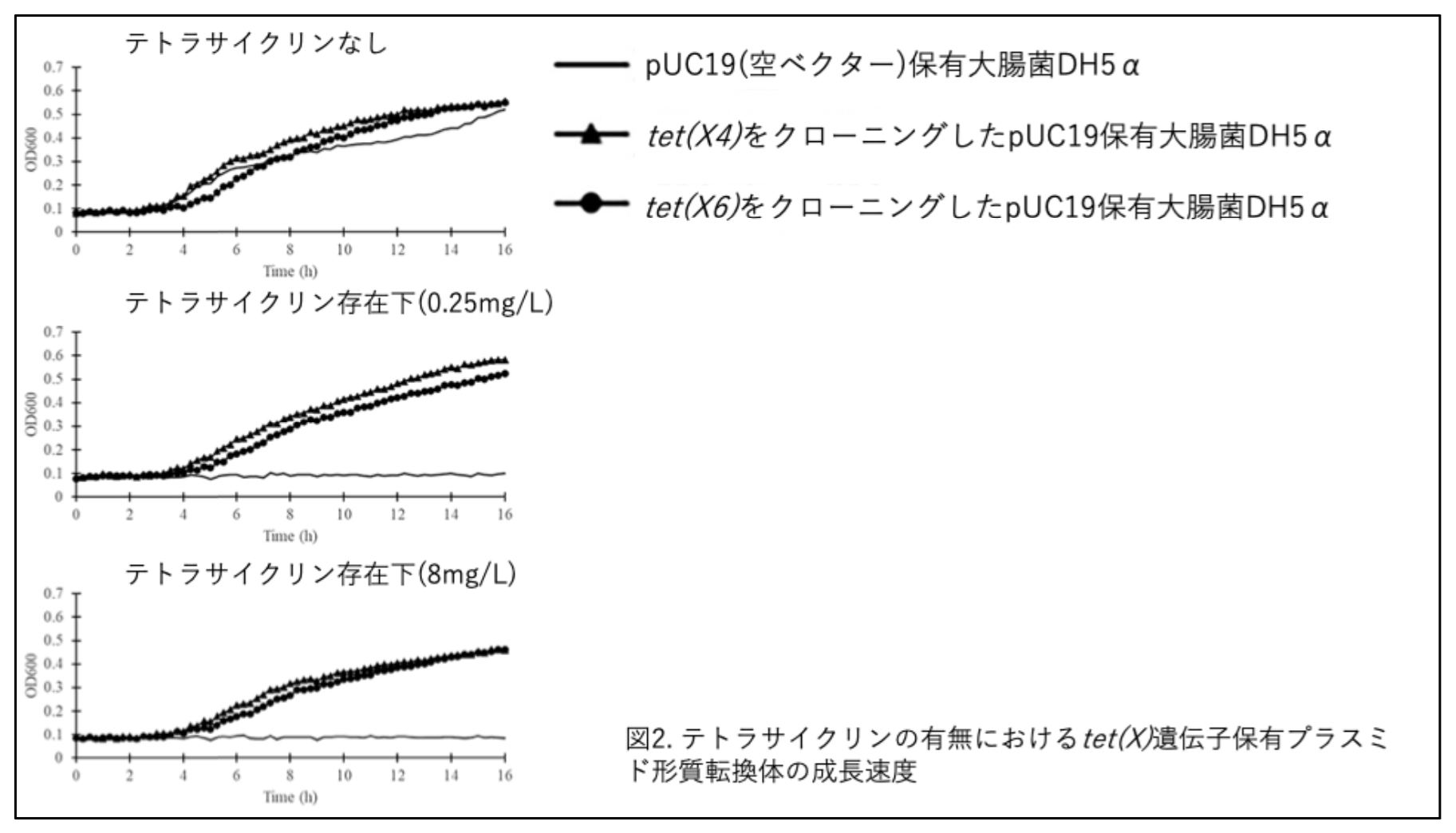 次に、接合伝達した菌株について、テトラサイクリン非存在/存在下での増殖性を検討したところ、テトラサイクリン存在下(0.25mg/L及び8mg/L)において接合伝達した菌株で接合伝達前の菌株に比べて成長速度が速く、菌数も多い傾向を示しました(図1)。また、tet(X)遺伝子をクローニングしたプラスミドを形質転換で導入した大腸菌においても、テトラサイクリン存在下(0.25mg/L及び8mg/L)において成長速度が速く、菌数も多い傾向を示しました(図2)。