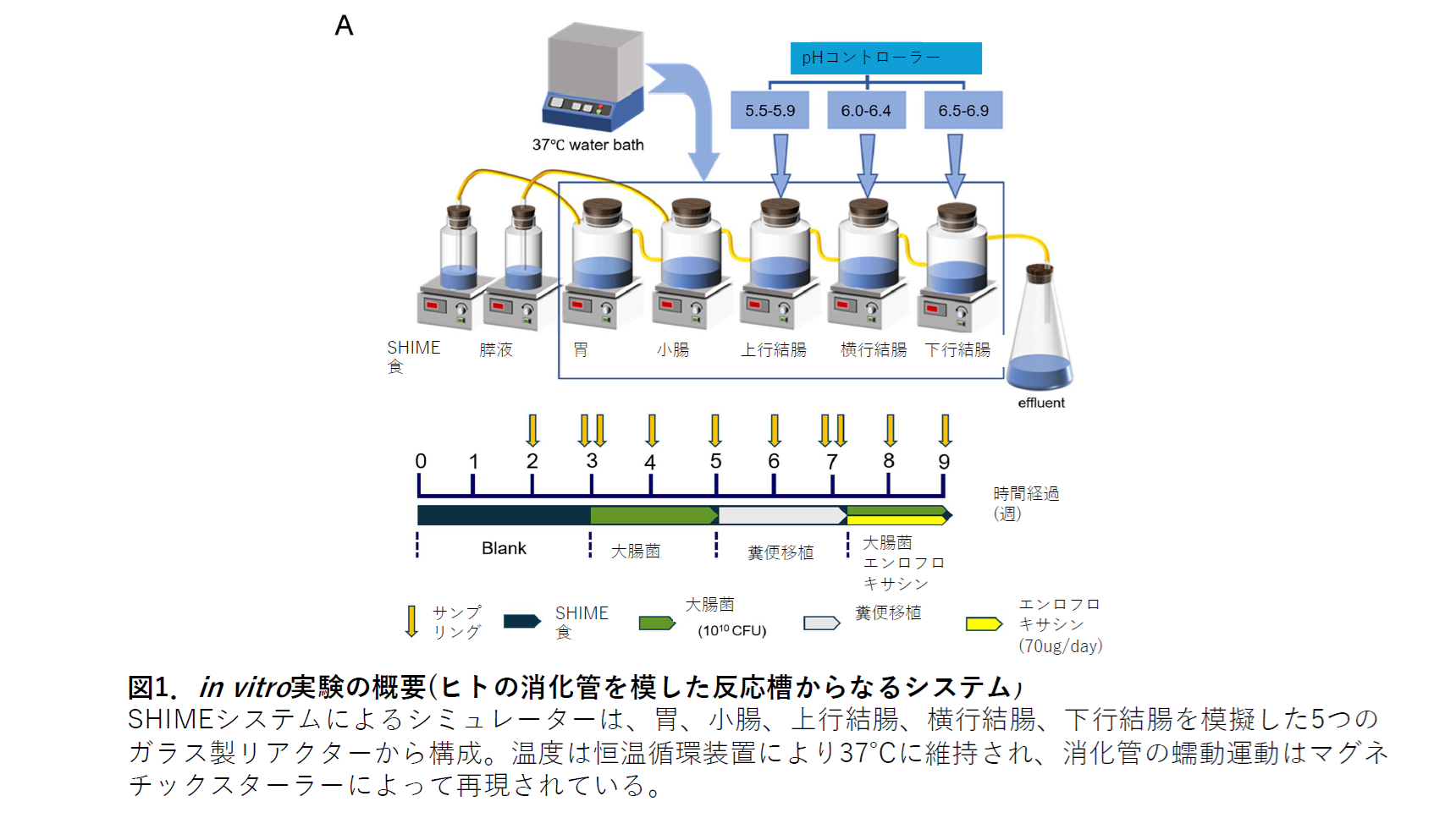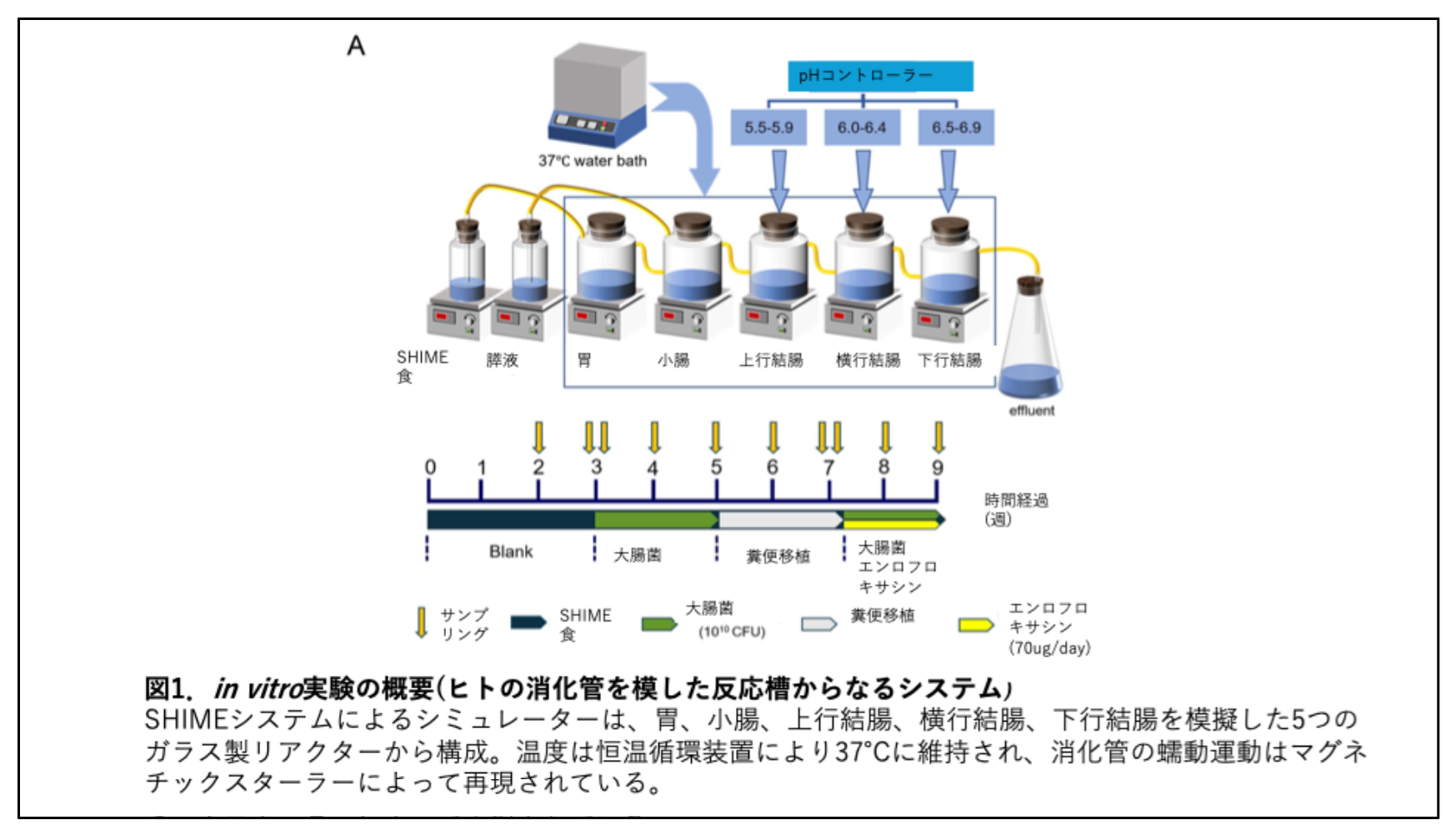 in vitro (SHIME): ヒトの消化管(胃、小腸、上行・横行・下行結腸)を模した5つの反応槽からなるシステムを使用しました(図1)。中国の成人の平均的な食事性曝露量に相当する1日70µgのエンロフロキサシンを14日間投与しました。