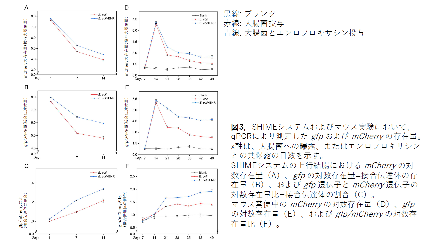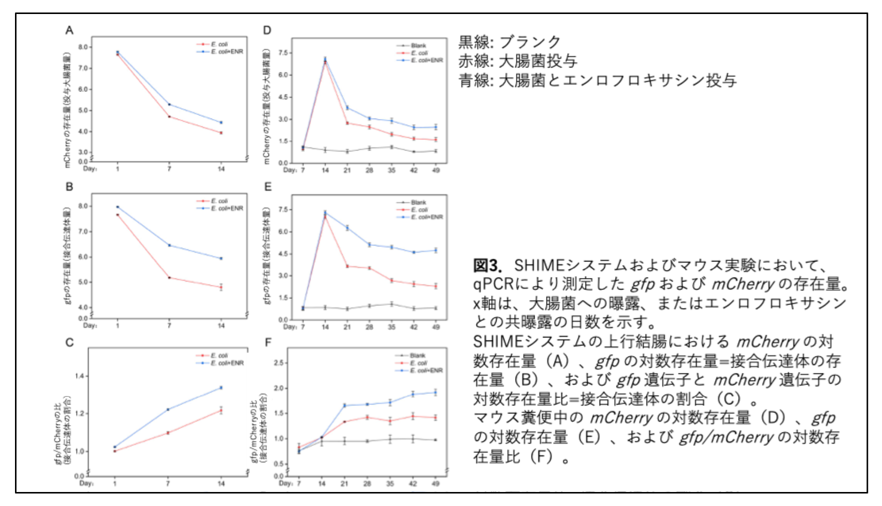 エンロフロキサシン曝露は、耐性プラスミドの細菌間で水平伝達も促進しました。in vitroで、gfp/mCherryの比率(接合体の割合)が、エンロフロキサシン曝露によって1.1倍に増加しました(図3B, C)。in vivoでは、この比率が1.4倍に増加しました(図3E, F)。このことは、低濃度のエンロフロキサシンが存在することによって、耐性遺伝子を持つ細菌が生存に有利になったことを示しています。