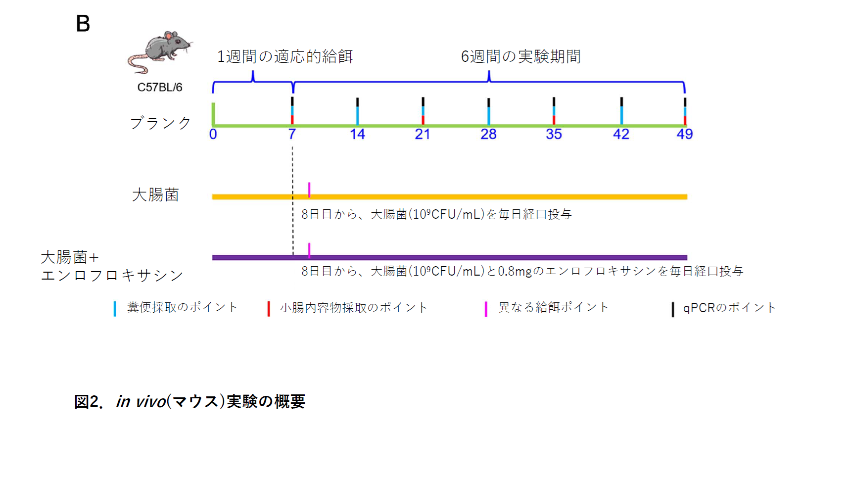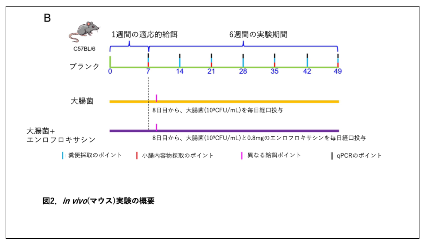 in vivo (マウス):マウスに対し、1日0.8mgのエンロフロキサシンを強制経口投与しました(図2)。