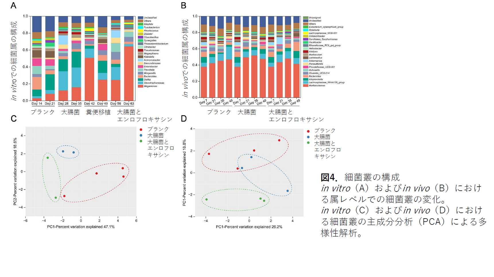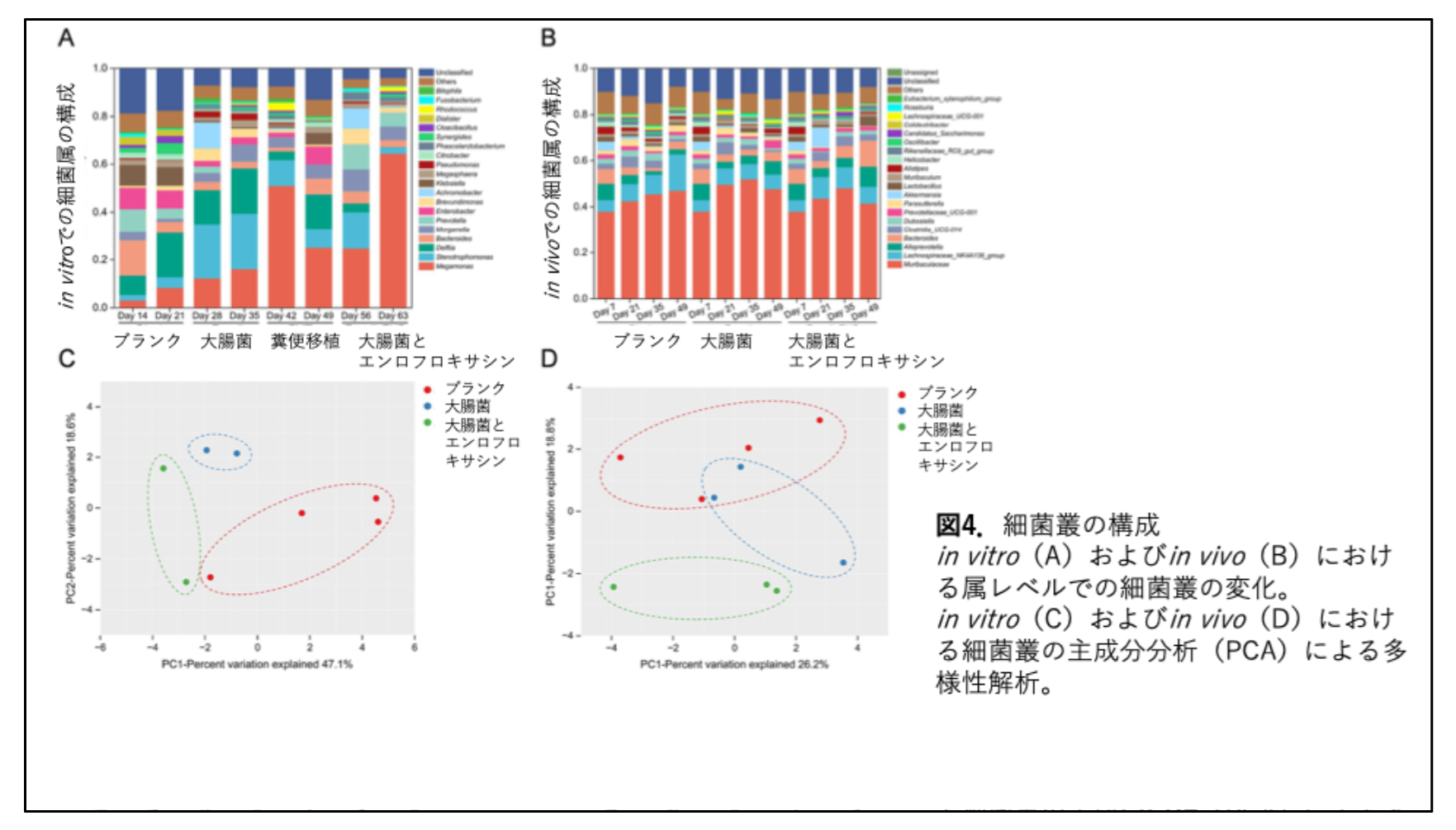 図4のA、Bはそれぞれin vitroとin vivoでの細菌叢の変化を評価したものです。棒グラフの縦軸は存在する細菌属の比率を示したものになります。また、図4のC、Dは、in vitroとin vivoでの細菌叢の変化を主成分分析**の結果となります。結果が表す通り、エンロフロキサシンの摂取は、in vitroとin vivoともに腸内細菌の種類やバランスを大きく変化させました(図4)。