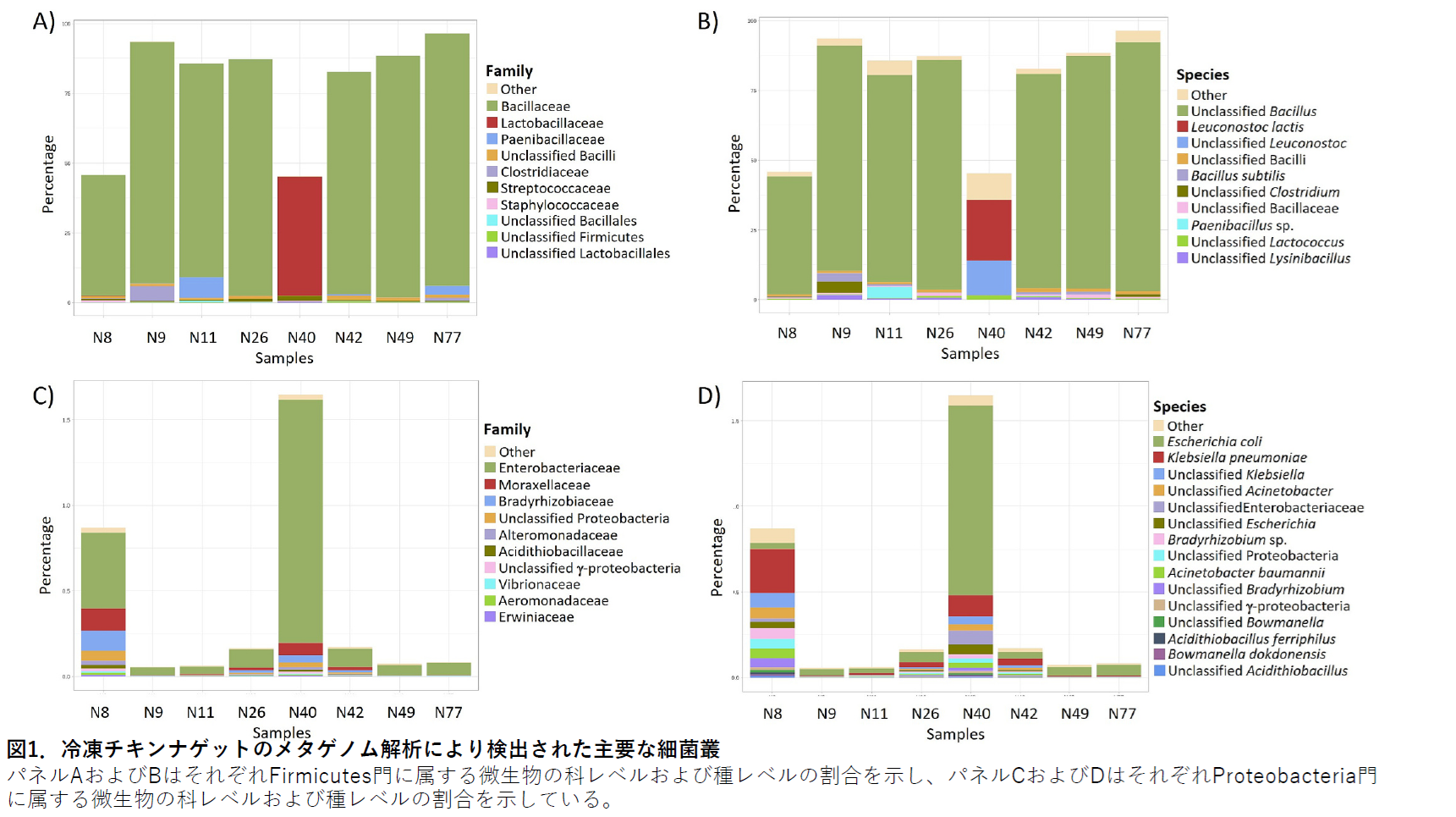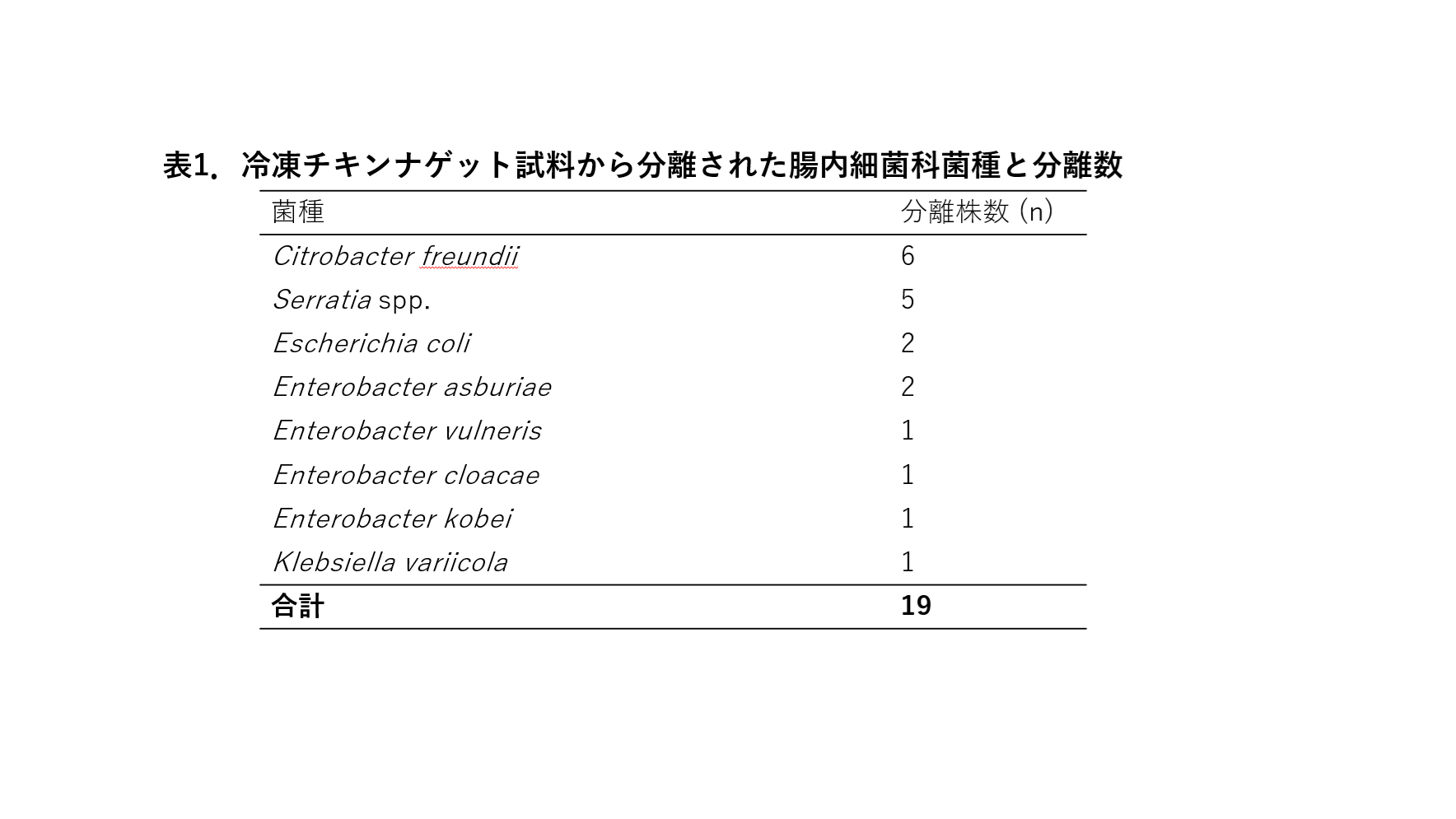 80検体の冷凍チキンナゲットを、セフトリアキソン、シプロフロキサシン、またはコリスチンを含む選択分離培養しました。分離菌の同定は飛行時間型質量分析装置(MALDI-TOF MS)により行い、薬剤感受性はディスク拡散法によって評価しました。さらに、8検体については ショットガンメタゲノム解析を実施しました。