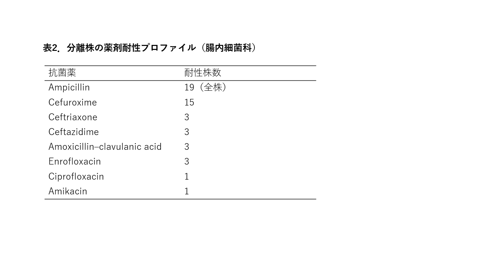 その結果、主にβ-ラクタム系抗菌薬に耐性を示し、加えて一部でキノロン系およびアミノグリコシド系抗菌薬に耐性を示す腸内細菌科細菌19株が検出されました(表1. 2)。また、Pseudomona属菌8株が分離され、その中にはコリスチンに対して耐性を示すPseudomonas fulva 1株が含まれていました。メタゲノム解析では、Firmicutes門(Bacillaceae、Lactobacillaceae、Paenibacillaceae)が優勢であり、γ-Proteobacteriaの割合は低いことが明らかとなりました(図1)。また、β-ラクタム、クロラムフェニコール、ホスホマイシン、リンコサミド、マクロライド、第四級アンモニウム化合物、アミノグリコシド、テトラサイクリン、およびグリコペプチドに対する耐性遺伝子が検出されました。